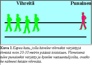 .Raitiovaunuissa kehittelimme useita eri versioita. Vaikuttavin oli seuraava: Kahdeksalla perättäisellä pysäkillä oli yksi vihreäksi värjätty kullakin ja punainen viimeisenä yhdeksännellä. Nousimme jokainen yksitellen samaan raitiovaunuun, joko yksin tai jonkun "normaalin" seurassa. Emme "tunteneet" toisiamme, vaan hakeuduimme kukin omaan paikkaamme.