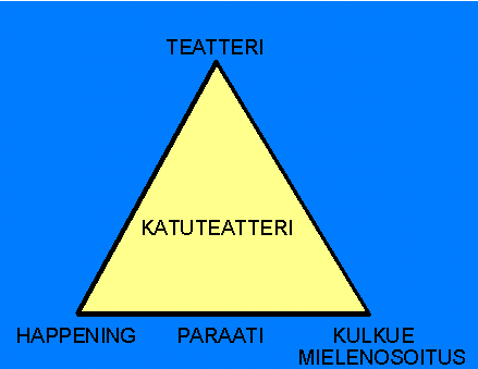 Kutsumme toimintaa katuteatteriksi, vaikka sitä voi tapahtua millä tahansa julkisella paikalla. Siksi emme käsittele erikseen kauppa-, pankki-, bussi-, kahvila-, puisto-, luento-, tai esimerkiksi raitiovaunuteatteria. Kyse ei ole normaaliteatterin ulkoiluttamisesta vaan toiminnasta, joka tehotakseen ei normaaliteatterin puitteissa olisi mahdollistakaan.